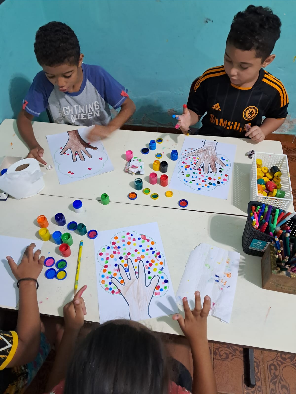 Terwijl ik nog snel de laatste dingen klaarzet, hoor ik drukke stemmen en een heel aantal voetjes die de trap afgestormd komen. Je moet weten dat het wijkcentrum een groot huis is met drie verdiepingen. De grote, gezamelijke ruimte waar we met z´n allen elke dag beginnen met ontbijt is helemaal bovenin, maar de ruimte waar ik lesgeef aan de kids is op de onderste verdieping. We lopen dus heel wat trappen op en af op een dag! Het groepje 7- en 8-jarigen komt de ruimte ingerend: “Tante, wat gaan we vandaag maken?” is de eerste vraag. Het is donderdagochtend en dat betekent knutselochtend! Sinds begin dit jaar geef ik niet alleen bijbelles aan het groepje 7 en 8 jarigen, maar ben ik ook verantwoordelijk voor de knutselochtend, iets waar ik echt van kan genieten! Wie mij een beetje kent, weet dat ik erg ervan houd om creatief bezig te zijn en als kind al heel wat af knutselde, deze nieuwe taak is me dus echt op het lijf geschreven! Elke week bedenk ik weer wat leuks om samen met de kids te maken: van armbandjes, tot papieren bekerdiertjes; van kliederen met verf en zoutdeeg, tot het in elkaar zetten van een heuze, papieren luchtballon. Wat is het leuk om ze creatief bezig te zien, ieder met z´n eigen talent, verbeeldingskracht en voorkeur! Ik heb de afgelopen tijd gemerkt dat knutselen echt een leuke, laagdrempelige manier is om kinderen van alles te kunnen leren en hun ontwikkeling op verschillende vlakken te kunnen stimuleren. Het gaat veel verder dan alleen maar de basic kleur, knip en plak- vaardigheden; het is een manier om te werken aan zelfvertrouwen, uniciteit, uiten van emoties, ontwikkeling van creativiteit & fantasie, fijne motoriek, logisch nadenken, oplossen van problemen waar je tegenaan loopt, volharden en geduld oefenen, samenwerken met anderen en nog veel meer!